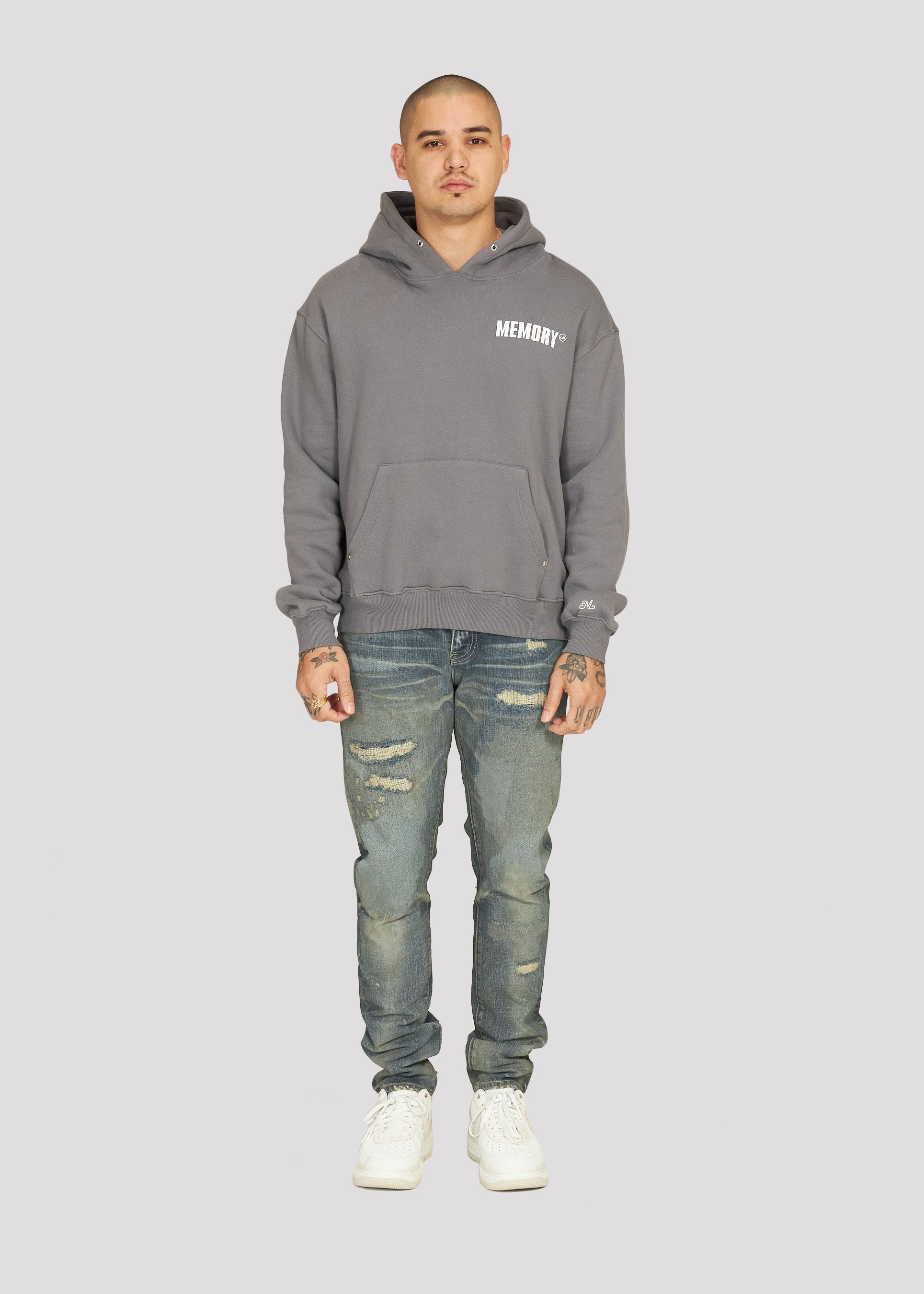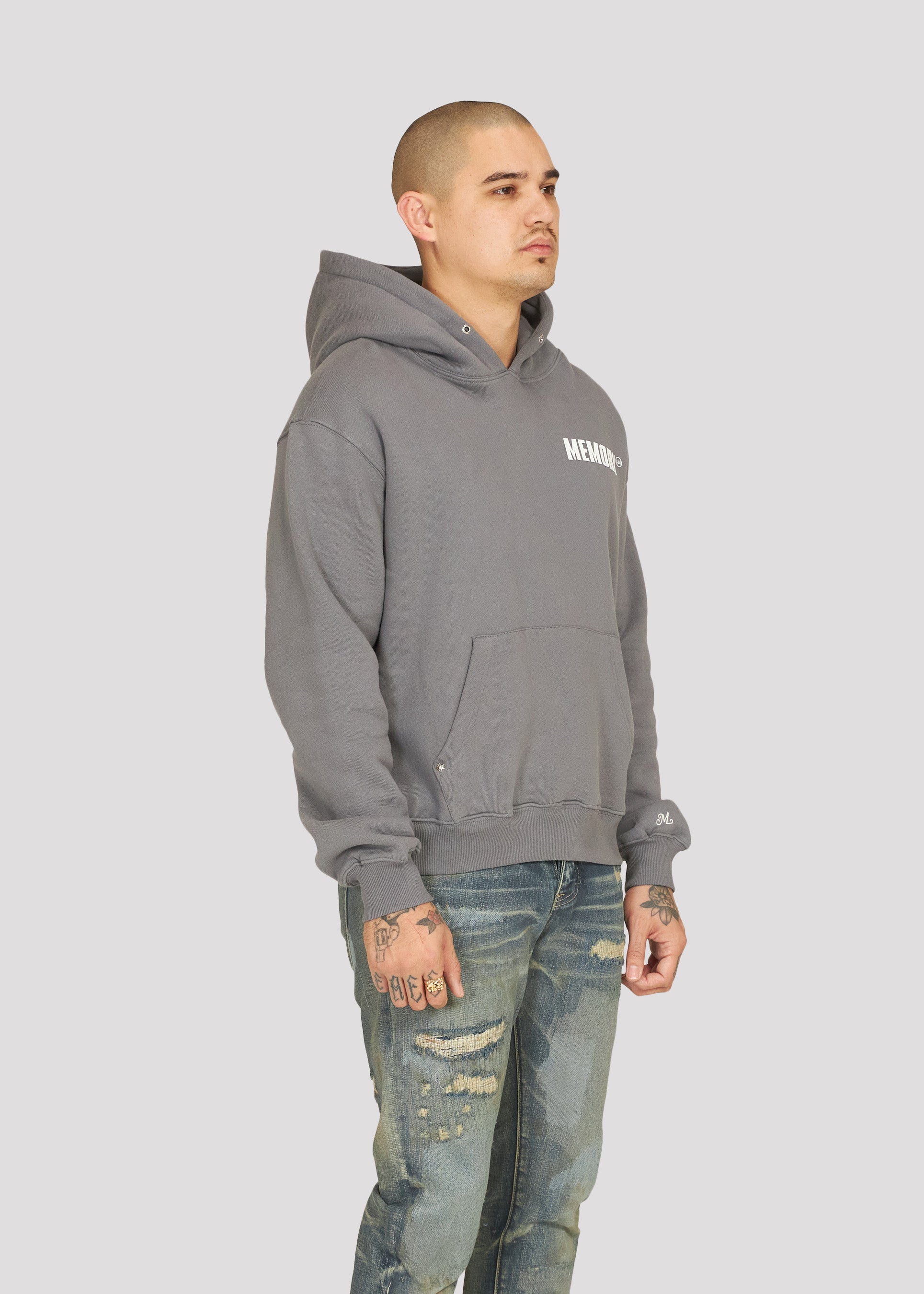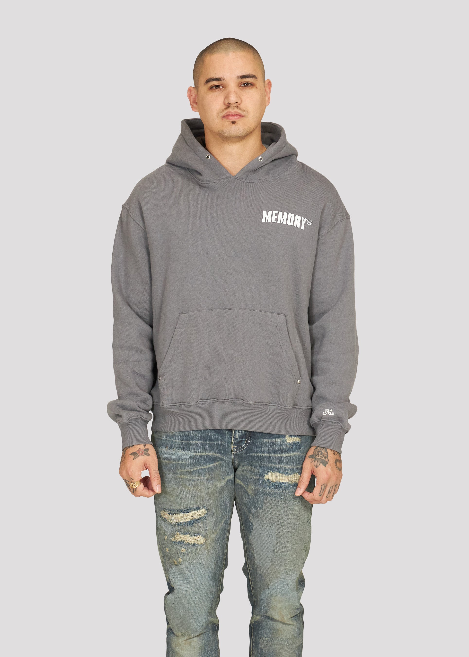 - Front kangaroo pocket with bullet hole rivets on stress points