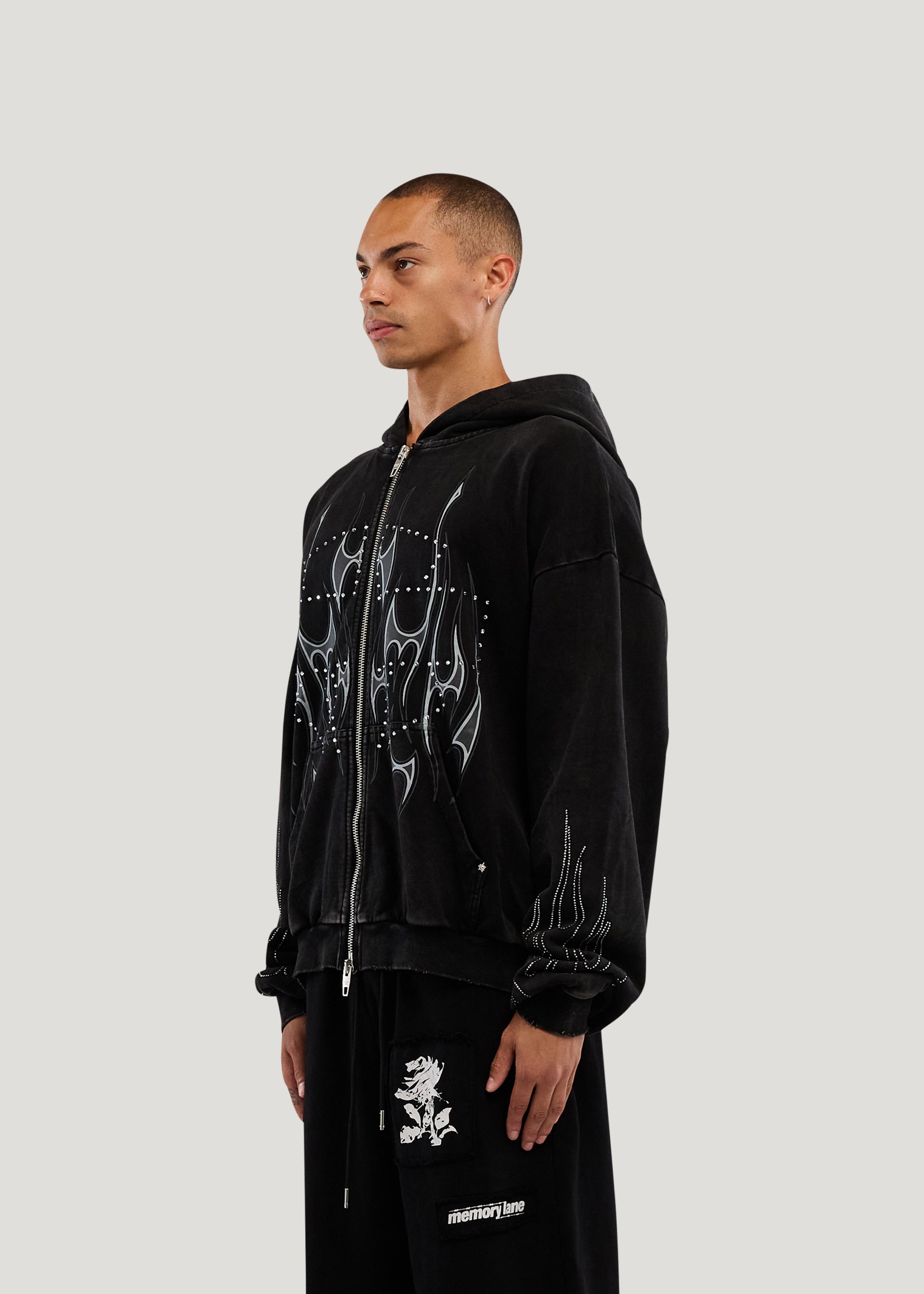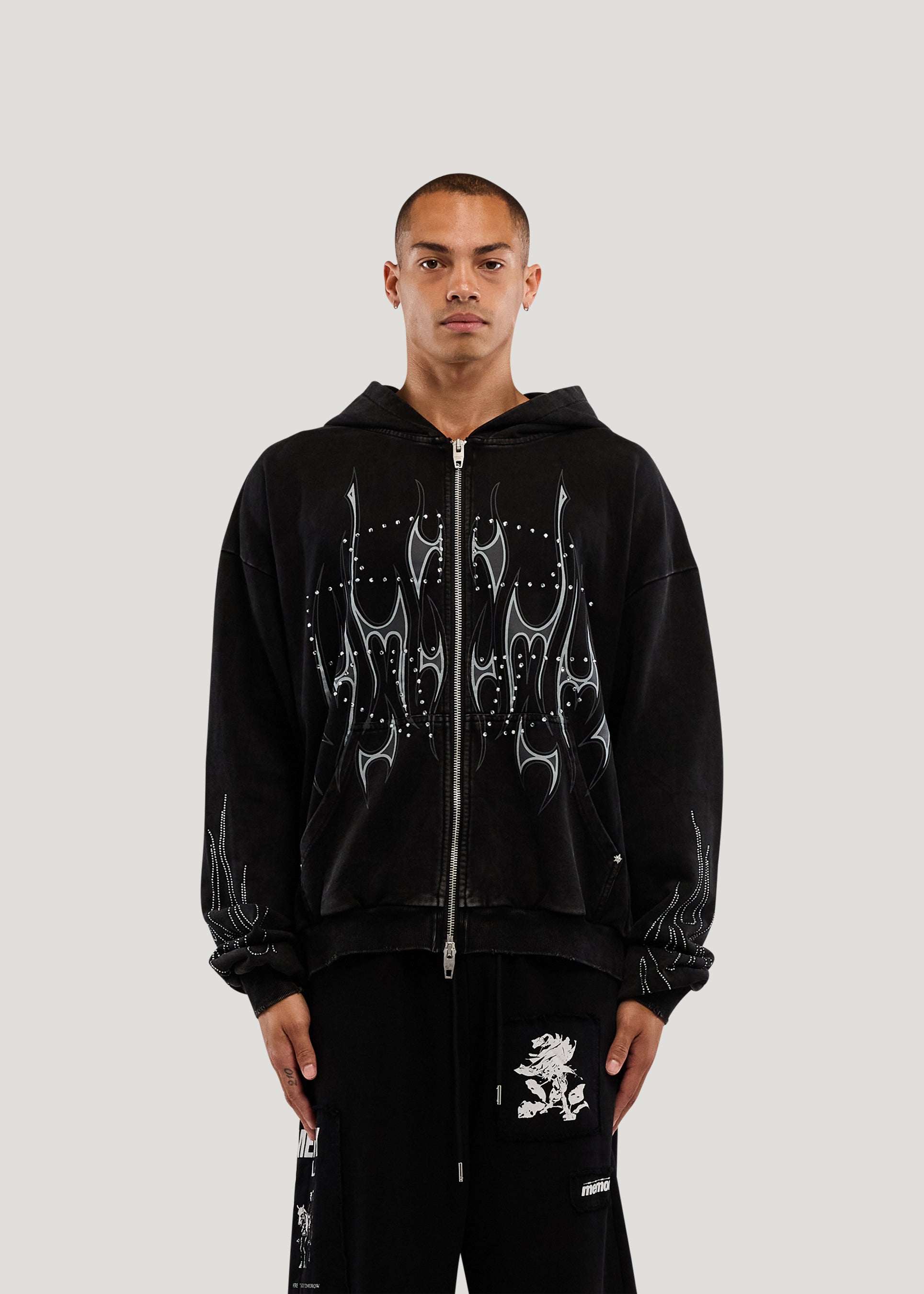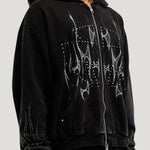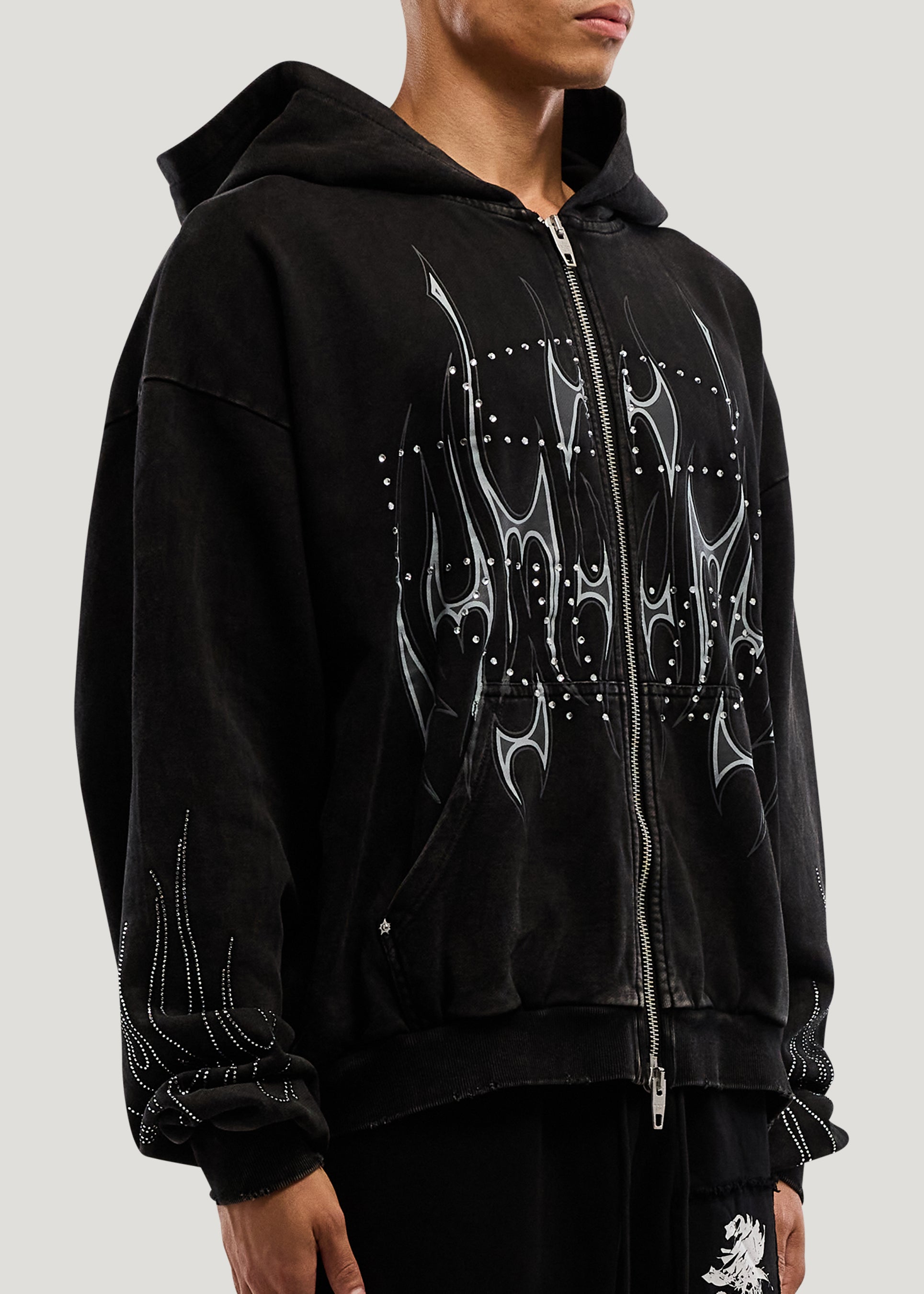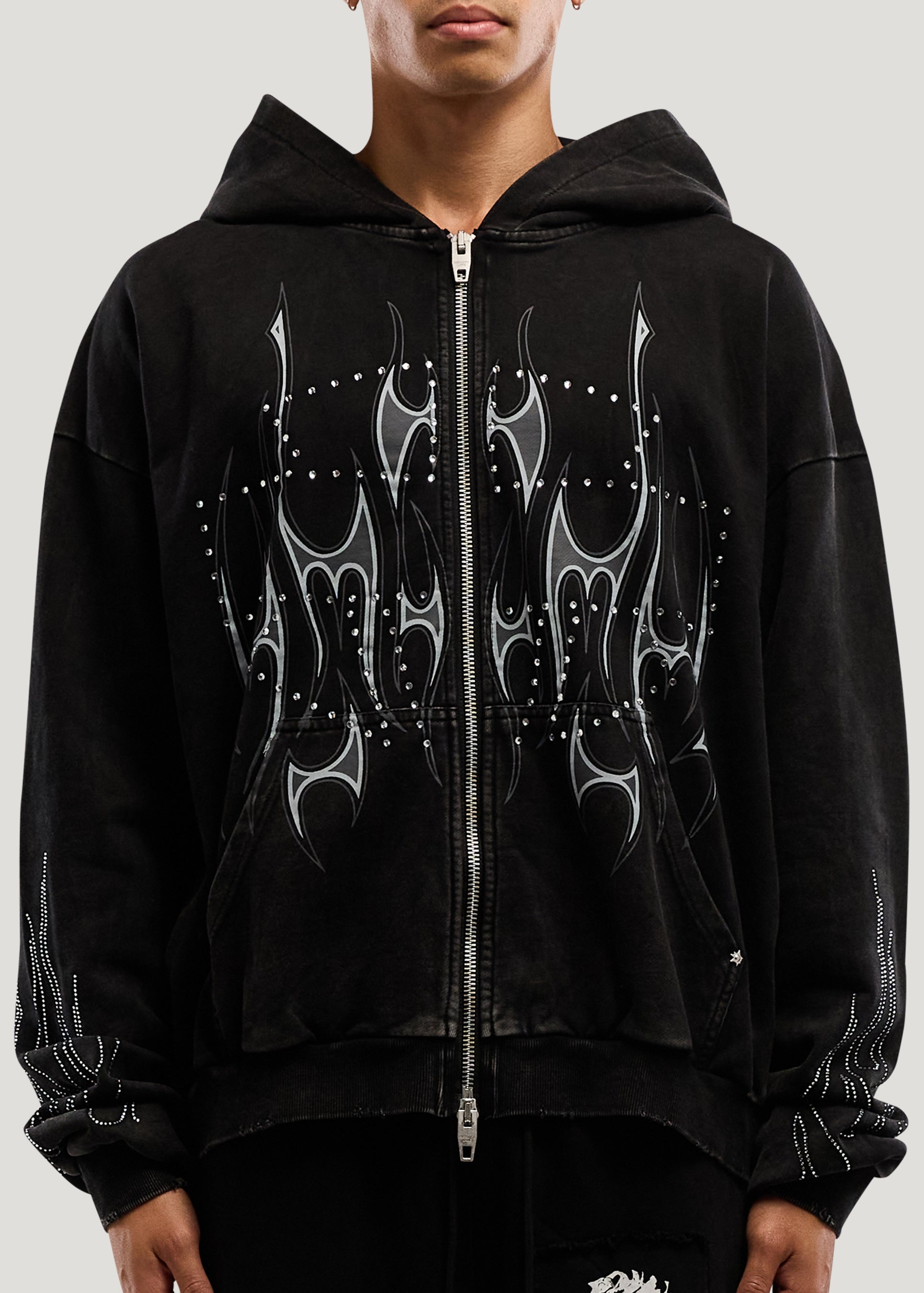 - 100% Cotton French Terry- Lightweight with distress wash- Oversize print on front- Crystal logo applique on front- Crystal flame applique on sleeves- Back print- 2 way front zip