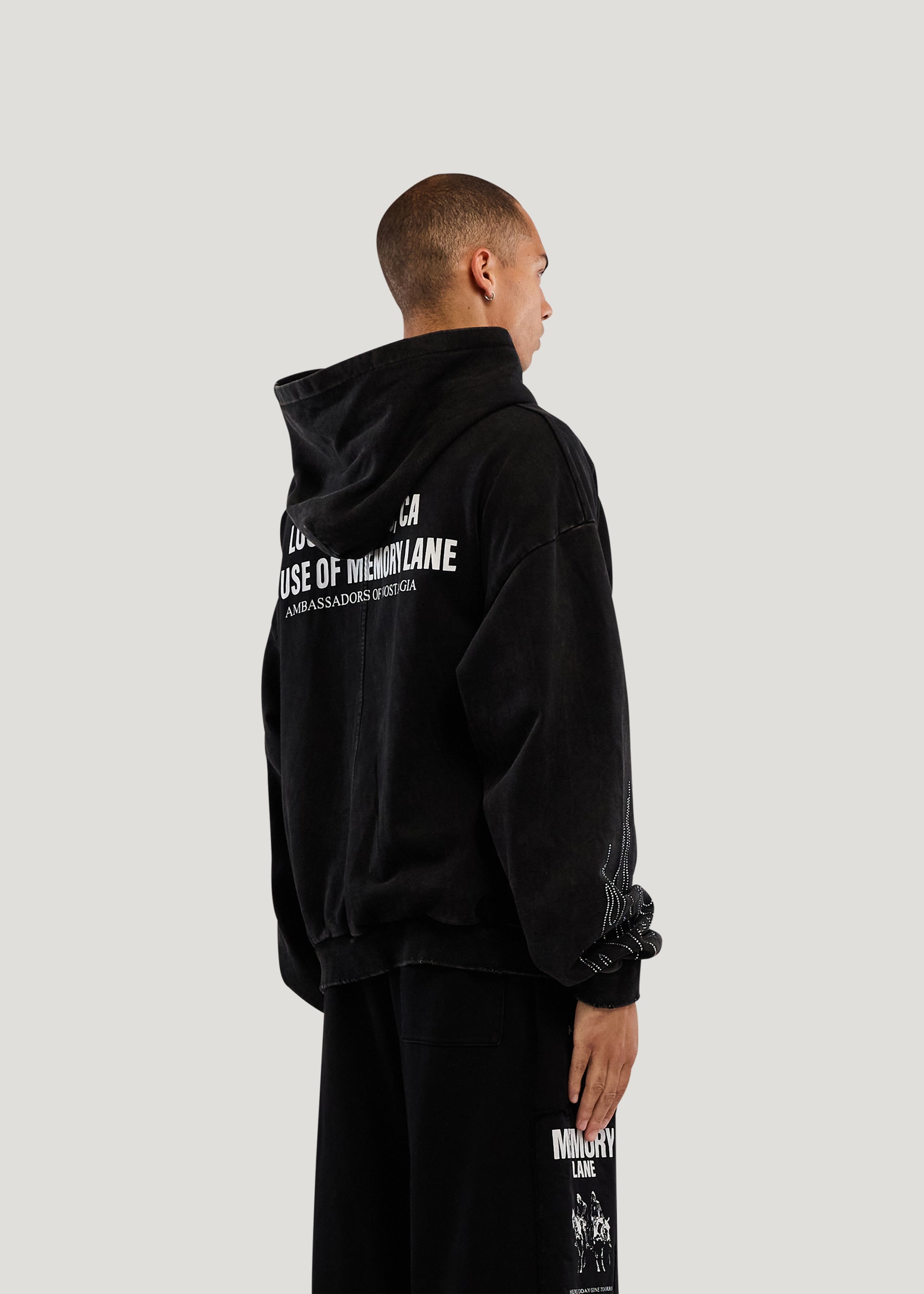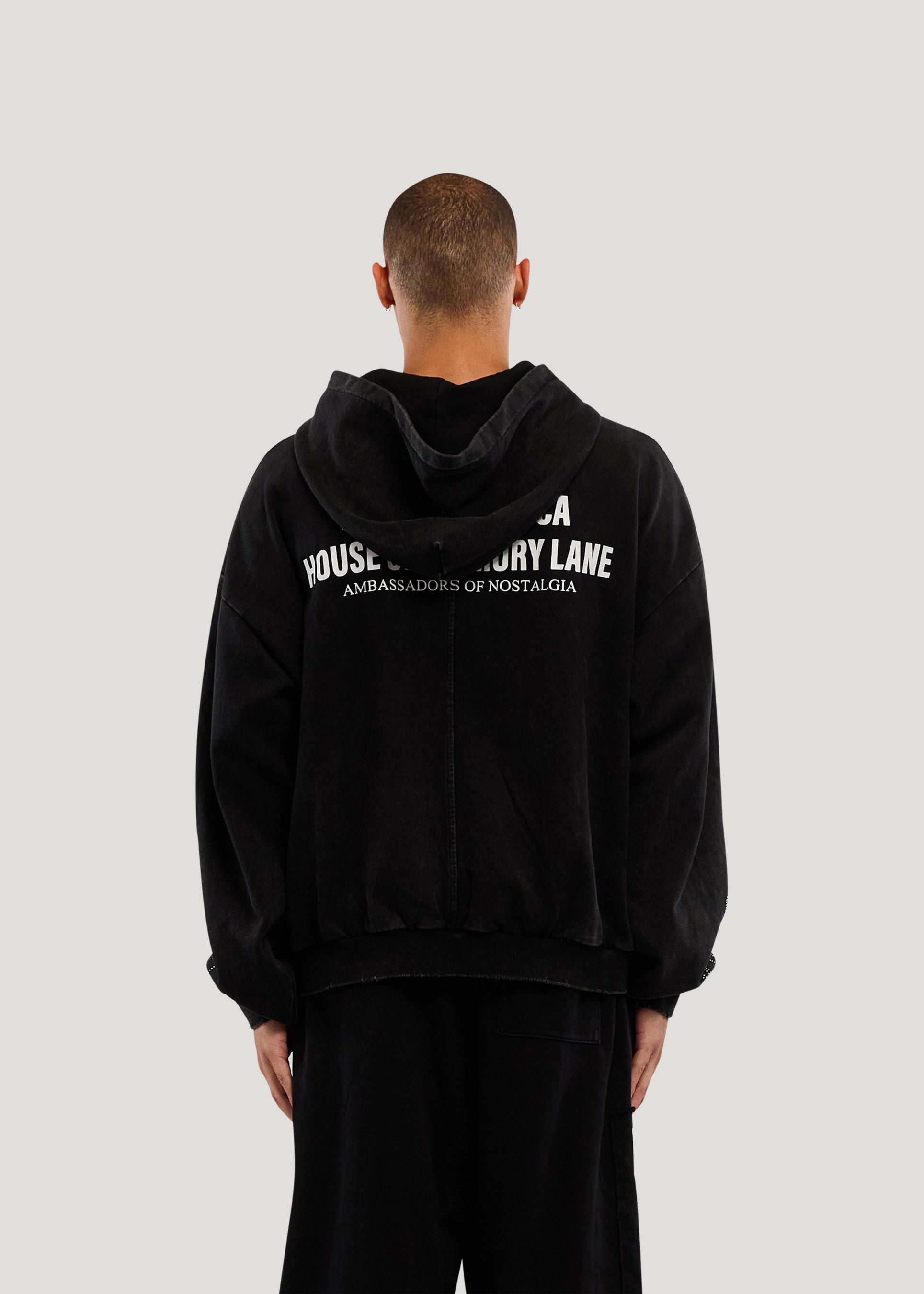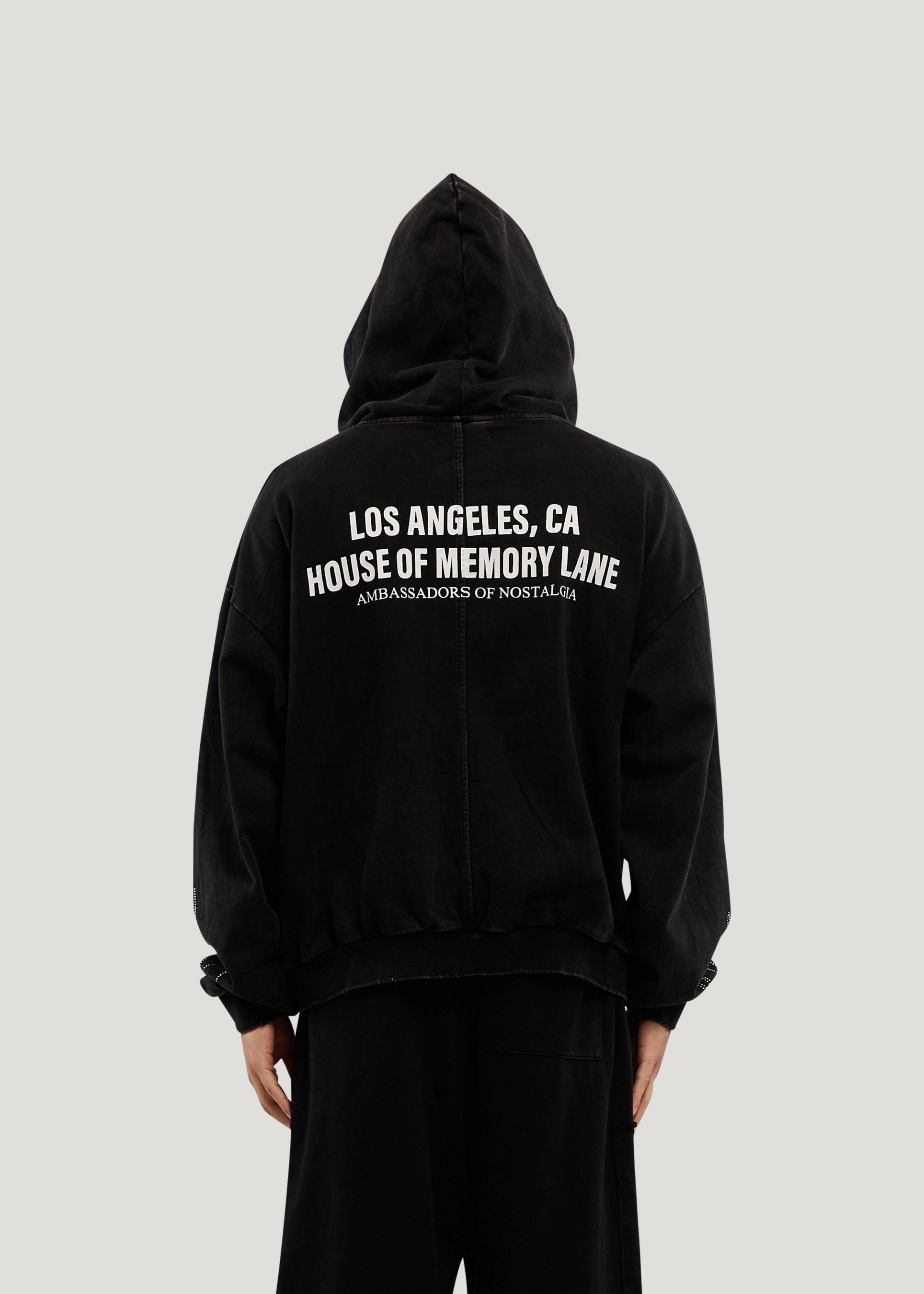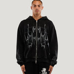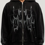 - 100% Cotton French Terry- Lightweight with distress wash- Oversize print on front- Crystal logo applique on front- Crystal flame applique on sleeves- Back print- 2 way front zip