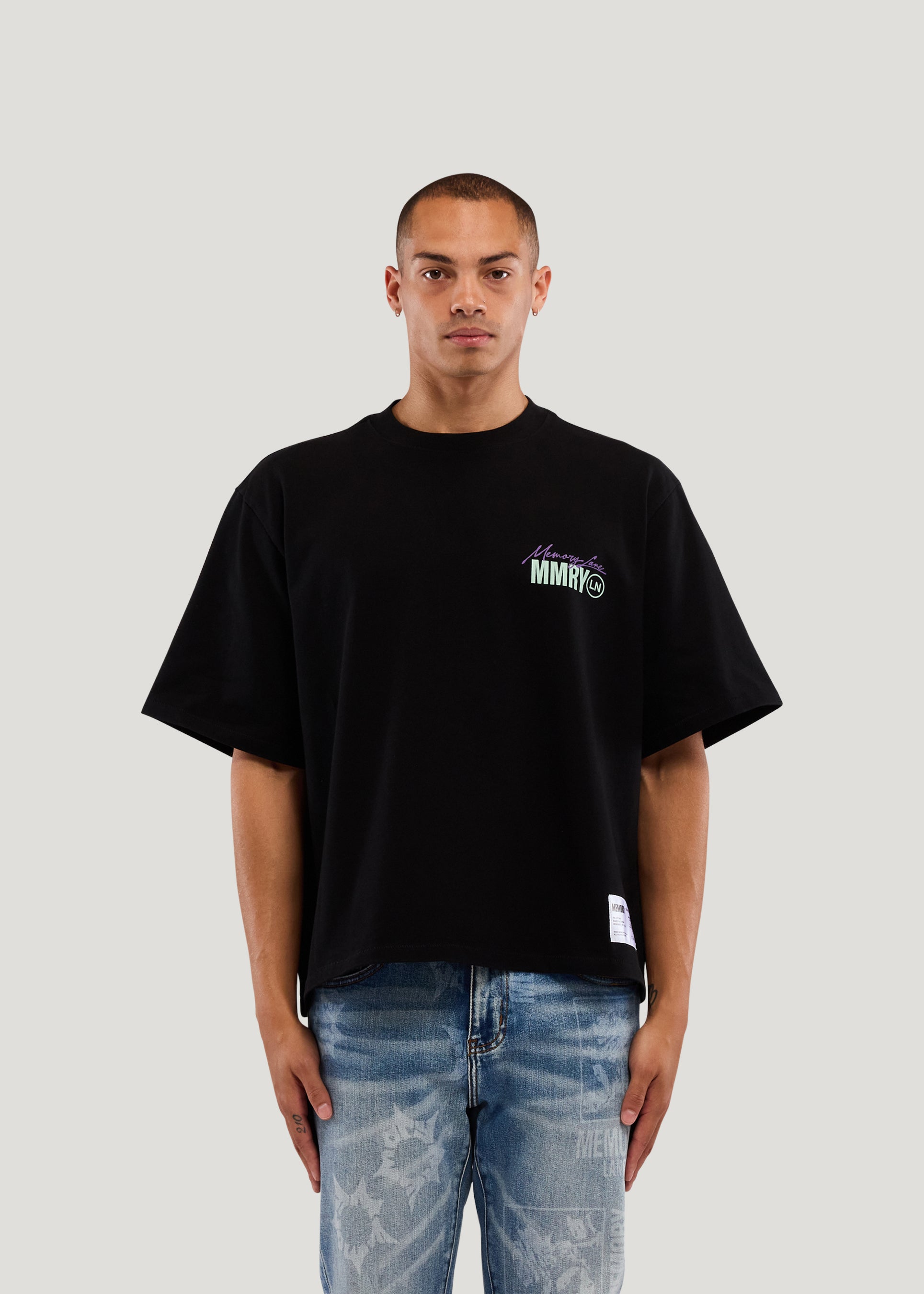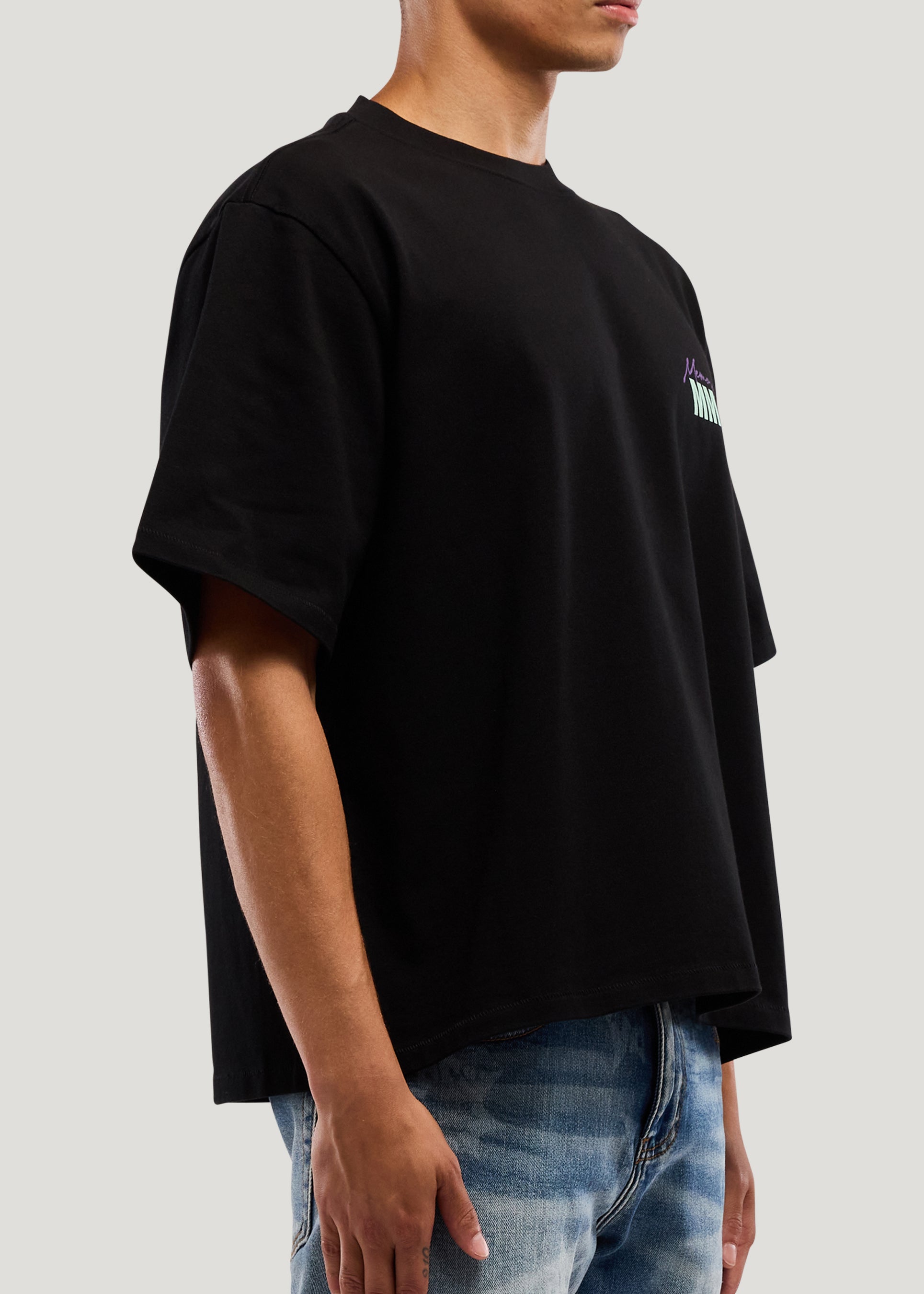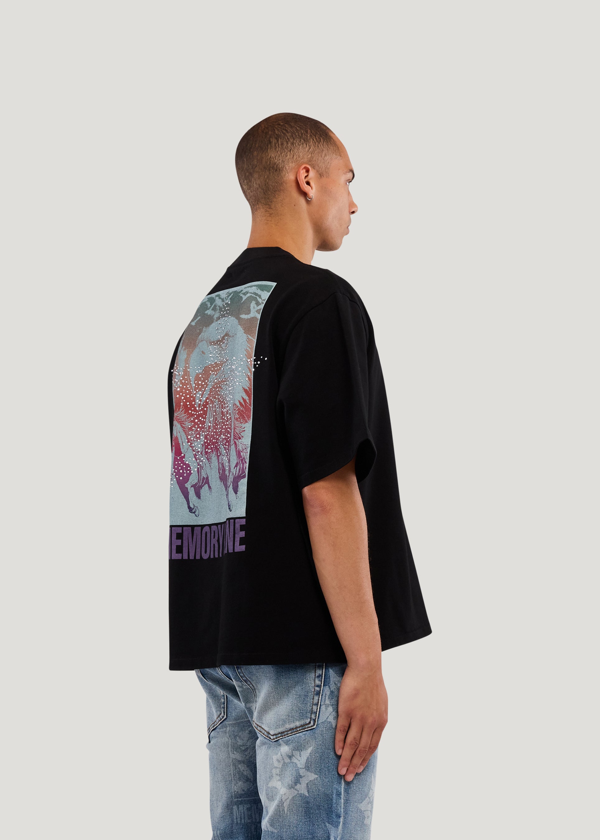 - 100% Cotton Jersey- Cropped Fit- 300 Gsm weight- Garment wash- Front chest hit- Back print with Crystal application- Bottom care content exterior label