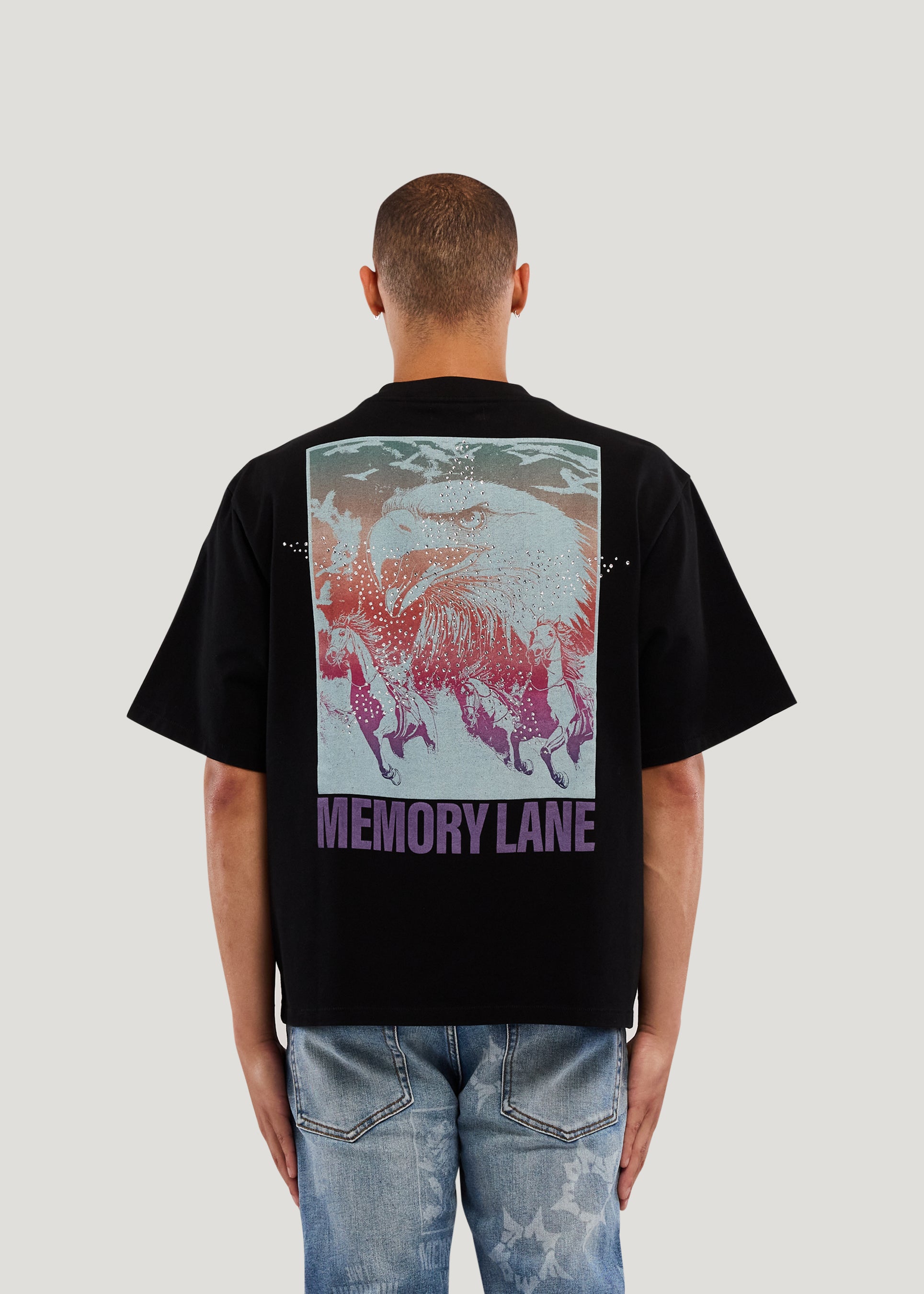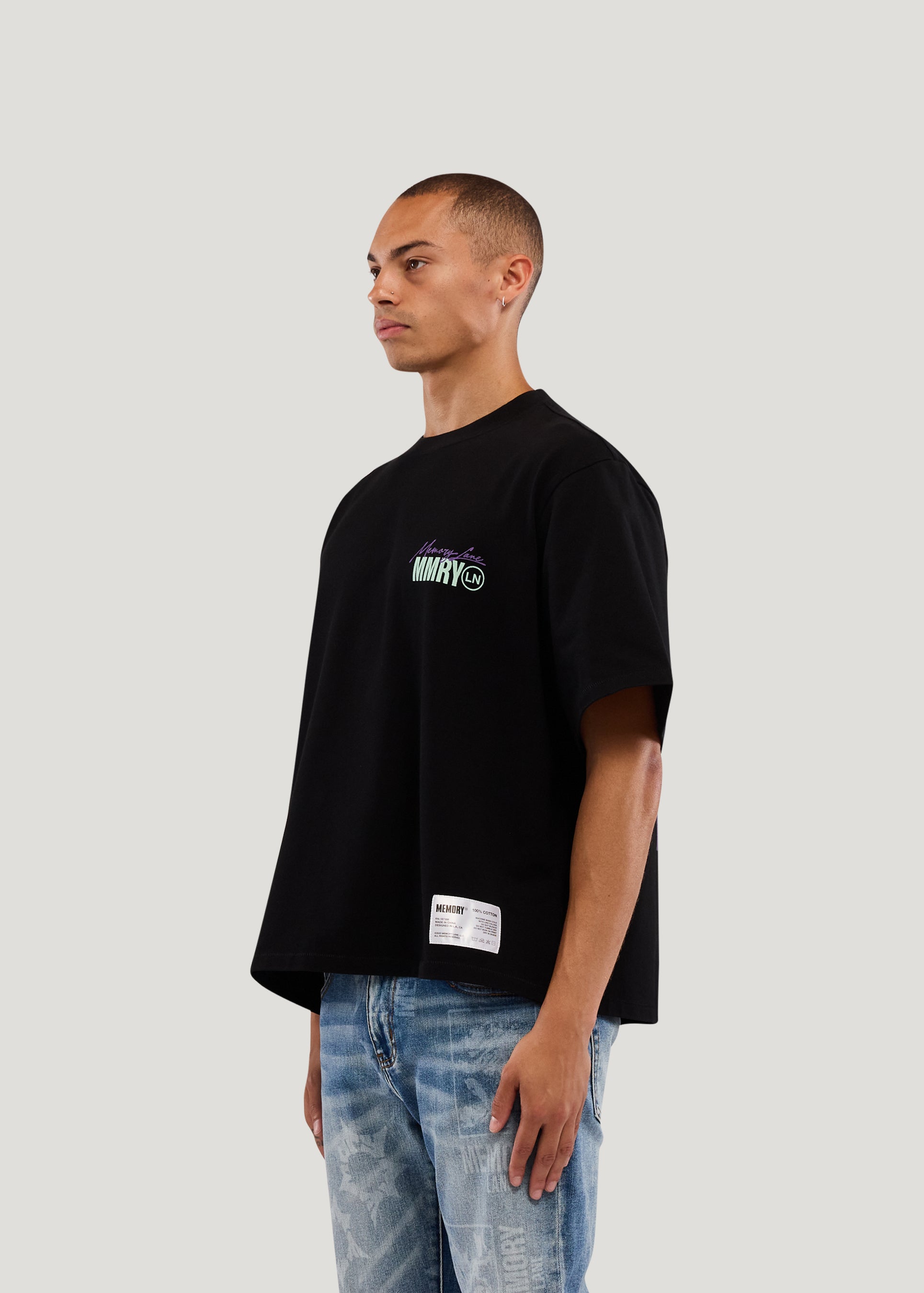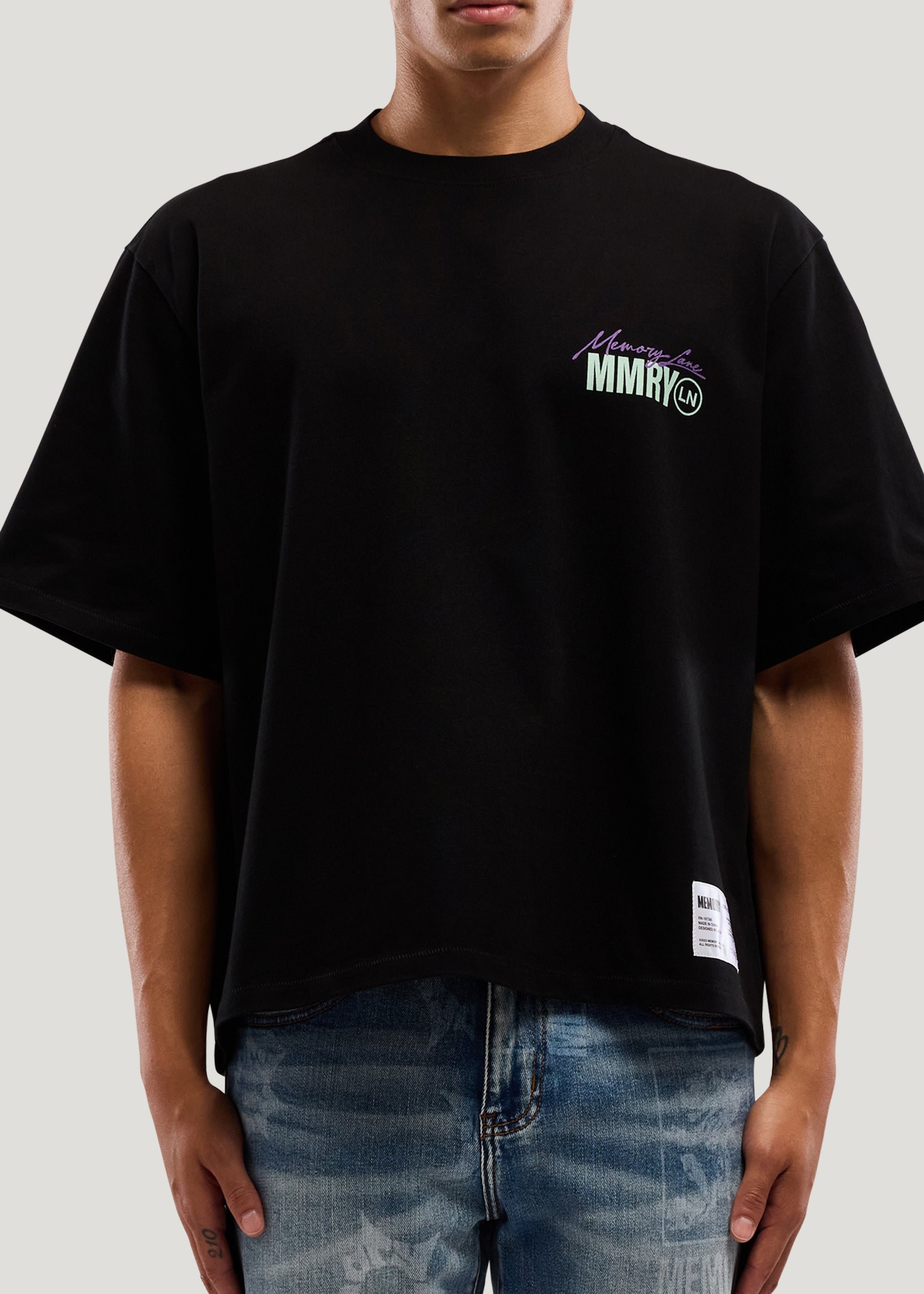 - 100% Cotton Jersey- Cropped Fit- 300 Gsm weight- Garment wash- Front chest hit- Back print with Crystal application- Bottom care content exterior label